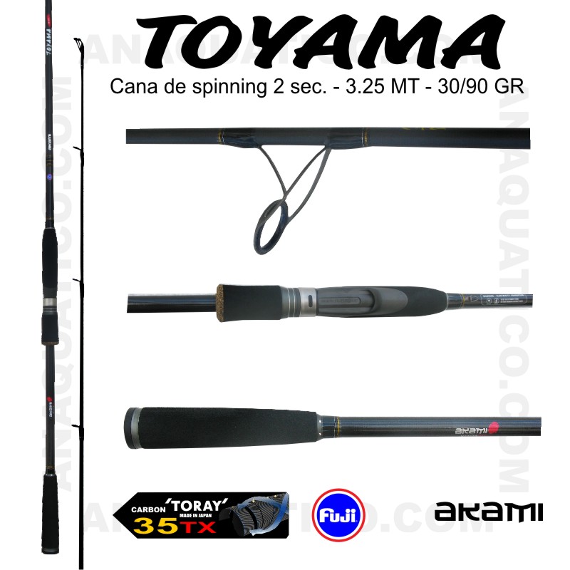 são 8 estas novas canas para spinning . Fabricadas em carbono 100% TORAY 35T com 6 fibras em espiral, as TOYAMA são graças a este carbono uma das gamas mais duráveis e leves do mercado. Também incorpora uma resina com partículas que impregnam a napa de carbono, obtendo uma estrutura mais leve, mais fina e mais resistente, capaz de transmitir sensações únicas na acção de pesca. Com este novo sistema, obteremos lançamentos precisos, alcançando um movimento muito rápido, que ao mesmo tempo nos permitirá lutar contra um peixe grande com total segurança. O seu cabo ergonómico é de fácil aderência, projectado para fixar a mão com total segurança, evitando escorregões ou golpes indesejados durante o lançamento ou levantamento do peixe. O novo sistema de alinhamento de secções oferece segurança máxima e alinhamento fácil. Totalmente equipadas com componentes Fuji KR e porta carretos Fuji. Inclui bolsa para transporte Premium da AKAMI.
