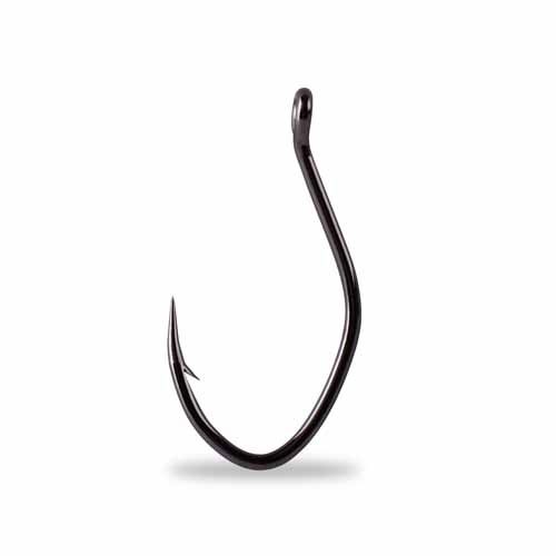 Três anzóis pretos para pesca em embalagem verde e branca com texto Mustad