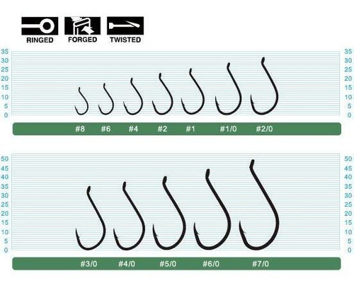 Conjunto de ganchos de pesca pretos em vários tamanhos organizados sobre fundo azul claro com indicações de tamanhos e características
