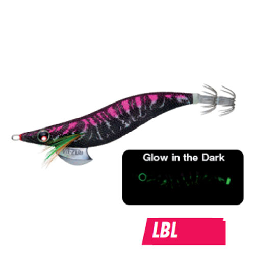 Isca de pesca preta e rosa com padrões brilhantes no escuro