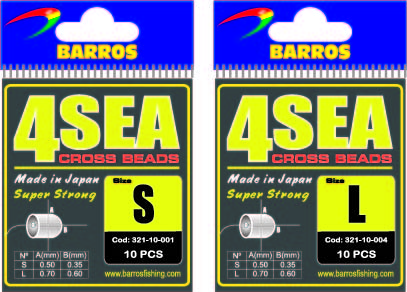 Embalagens azuis e amarelas de miçangas de pesca BARROS 4SEA CROSS BEADS nos tamanhos S e L