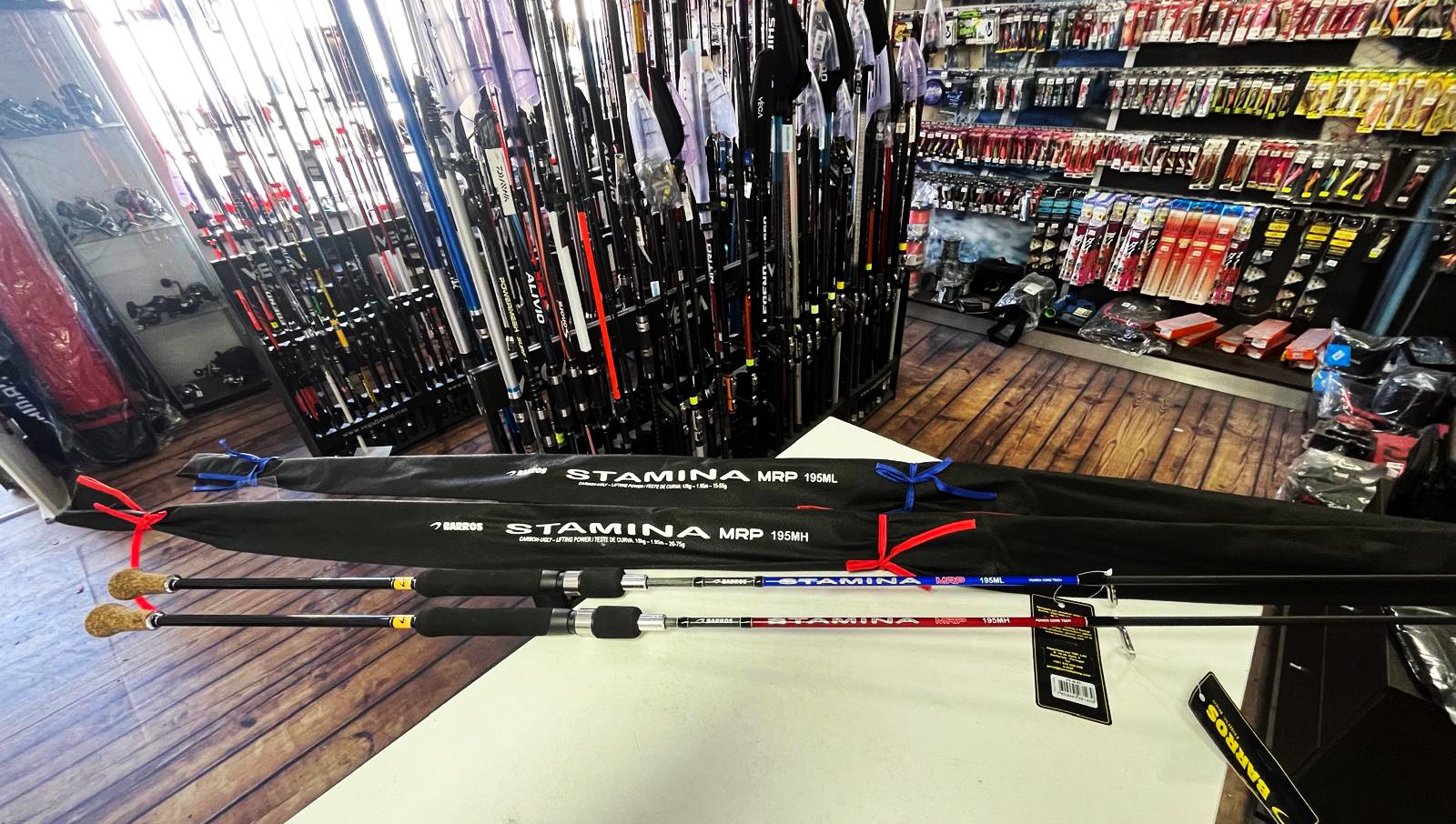 Loja com canas de pesca, capas pretas STAMINA MRF 100H e acessórios organizados na parede