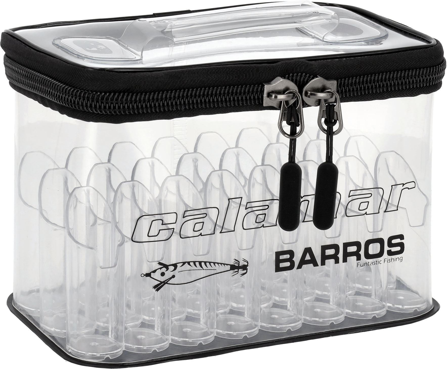 Bolsa em PVC transparente, 100% impermeável, para transporte e arrumação de palhaços. Os palhaços e/ou toneiras são arrumados individualmente em cada um dos compartimentos disponíveis dentro da bolsa, compartimentos esses que, por serem transparentes, permitem a observação das cores, mesmo do lado de fora. Os compartimentos individuais e a própria bolsa, são furados na base, para drenar a água. A Bolsa Calamar tem na tampa uma pega, para poder ser transportada.