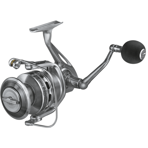 Carretel de pesca prateado com punho preto e texto DRAGO 7000