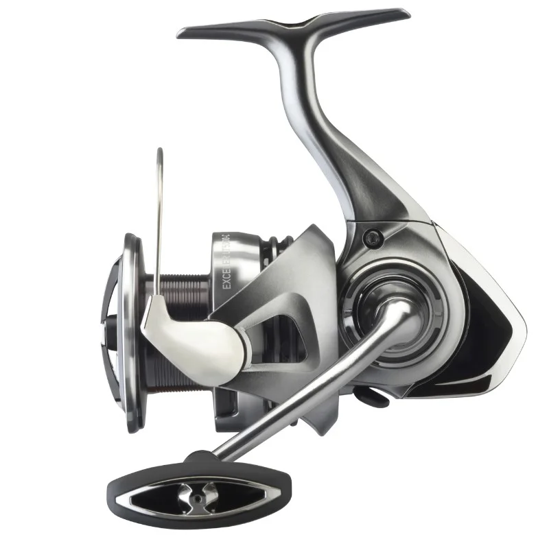 Carretel de pesca metálico cinza prateado isolado em fundo branco