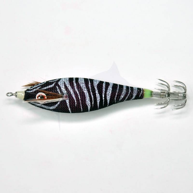 Isco de pesca com padrão de riscas pretas e brancas e anzóis múltiplos