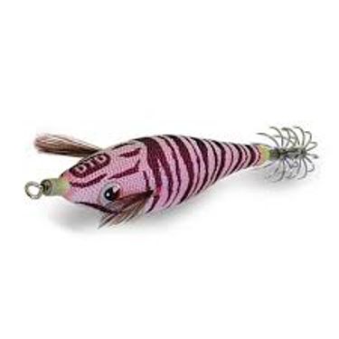 Isca de pesca em forma de camarão rosa com listras pretas e anzóis metálicos