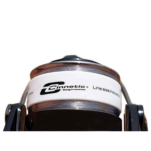 Rolo para carreto de pesca branco e preto com inscrição Ginnetic
