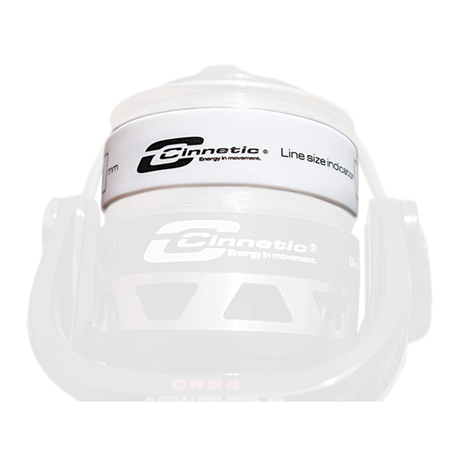 Carretel de pesca branco com texto e indicação de tamanho de linha