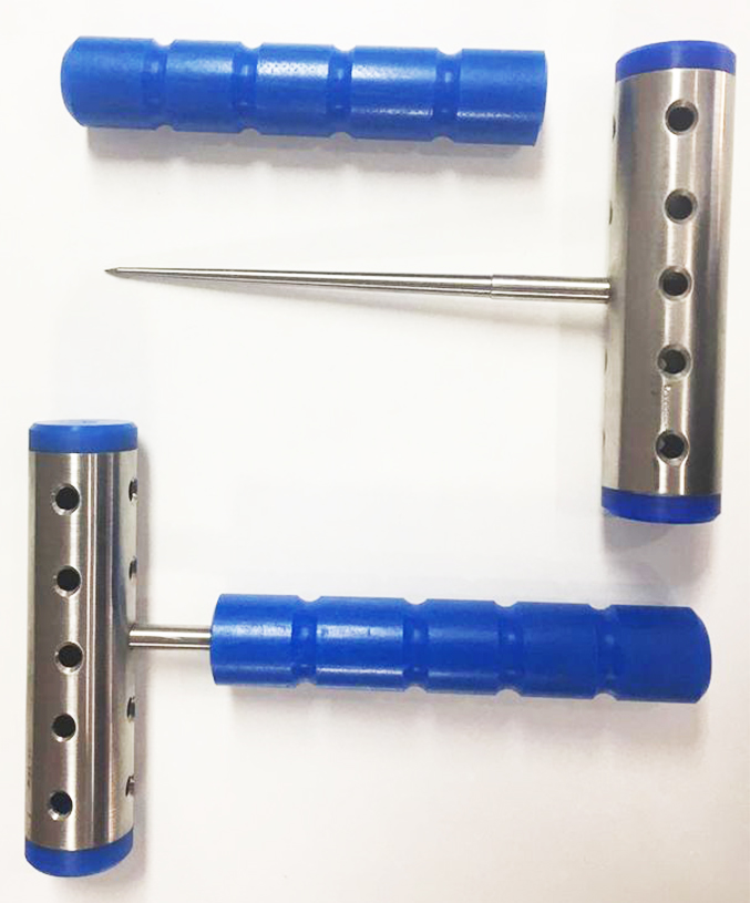 Ferramentas de cabo azul com partes metálicas prateadas e furos, sobre fundo branco.