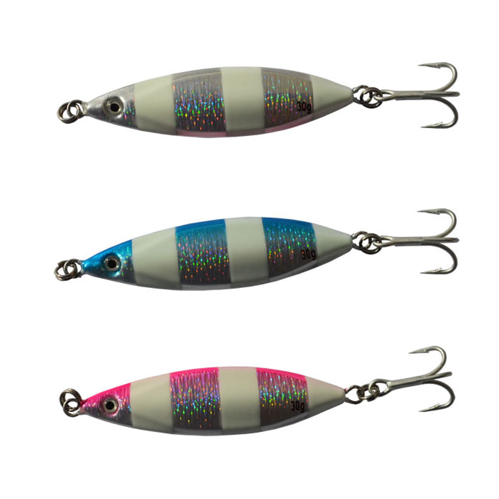 Isca de pesca metálica com faixas brancas e holográficas prateadas, anel de fixação