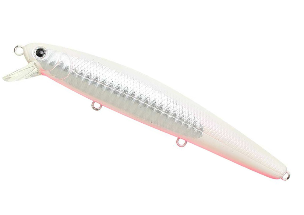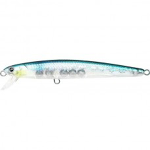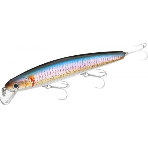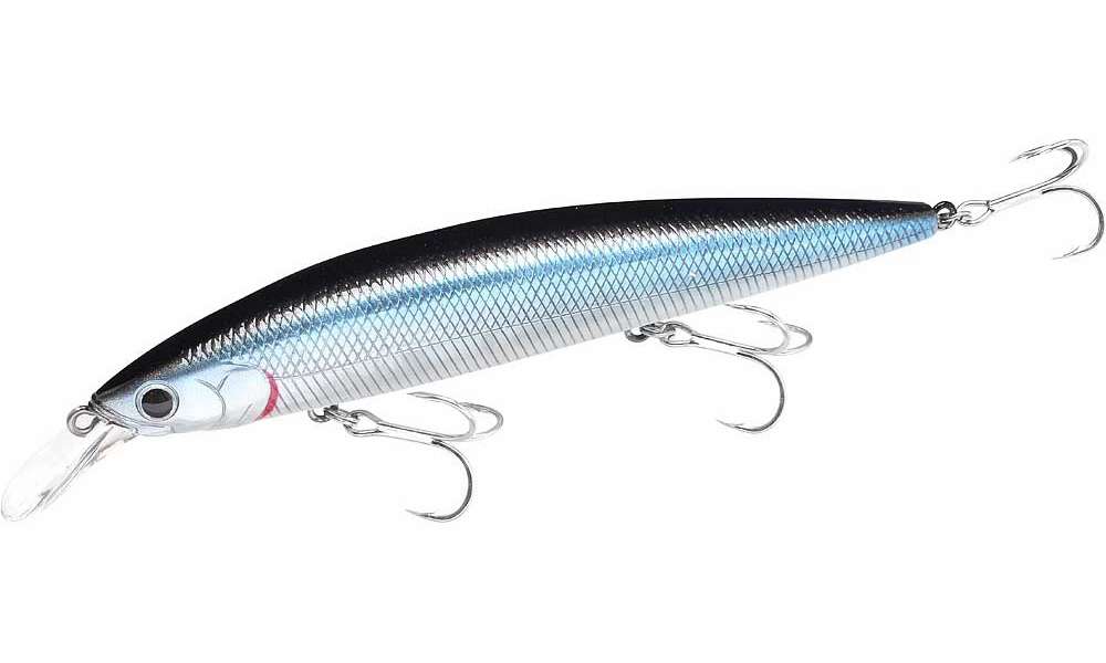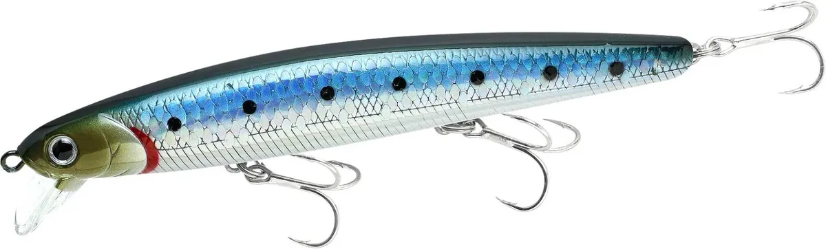 Isca de pesca jerkbait brilhante prateada e azul com detalhes vermelhos