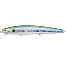 Isca de pesca artificial tipo minnow verde e prata com olhos detalhados e argolas metálicas.