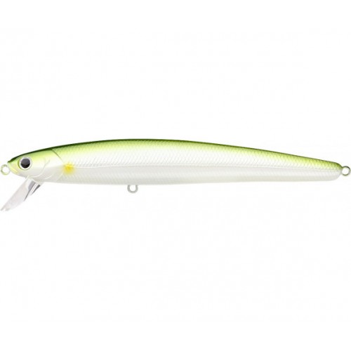 Isca de pesca artificial verde e branca com lâmina transparente and olhos grandes