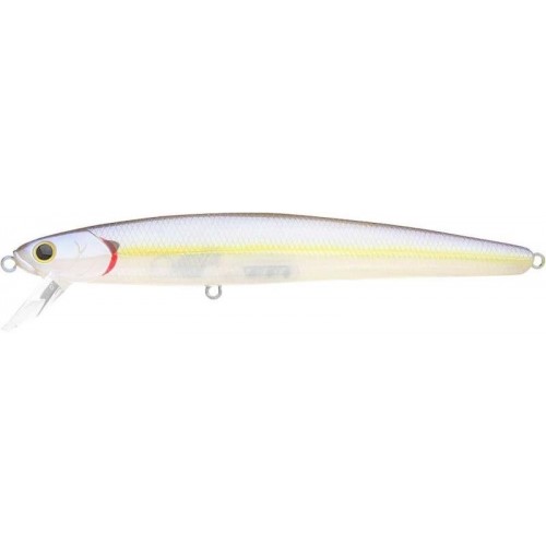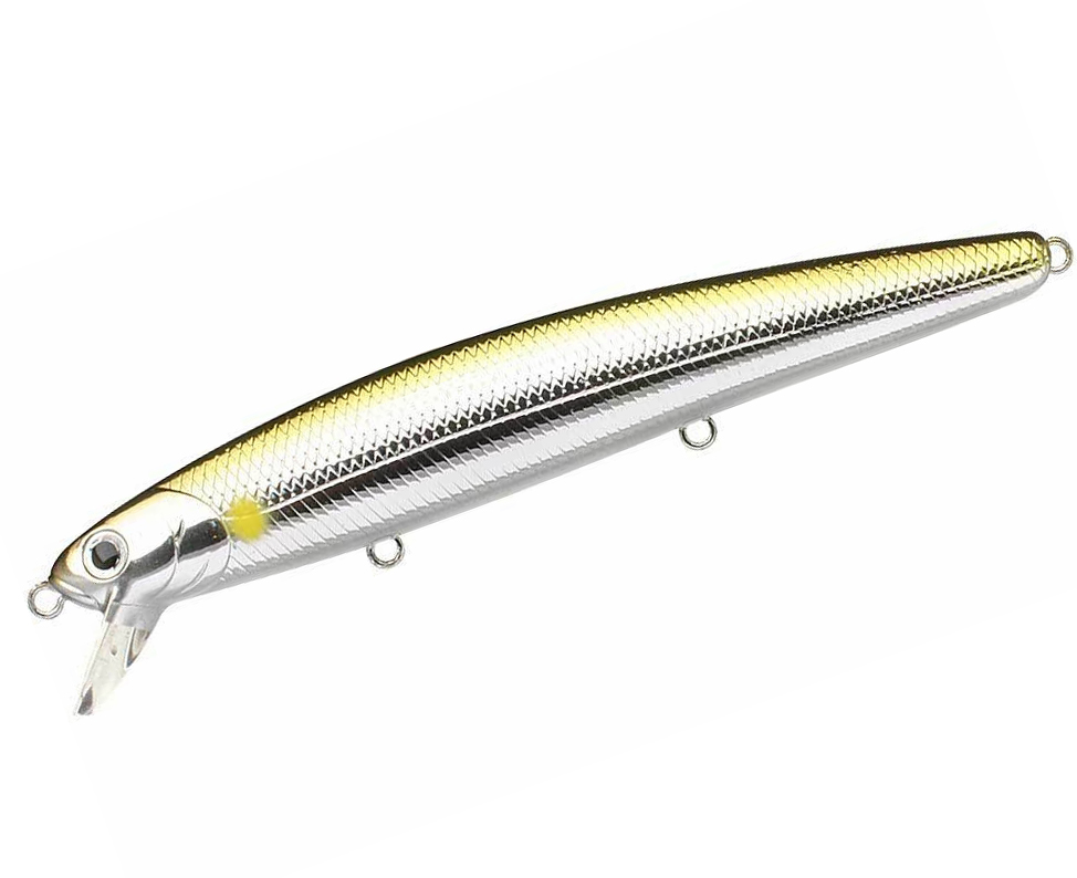 Isca de pesca prateada e amarela com textura escamada e barbela transparente