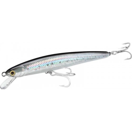 Isca de pesca crankbait prateada com reflexos iridescentes e três anzóis metalizados