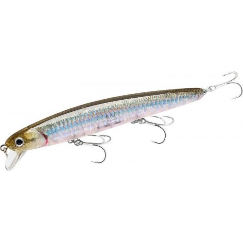 Isca de pesca tipo minnow com cores verde, castanho e dourado