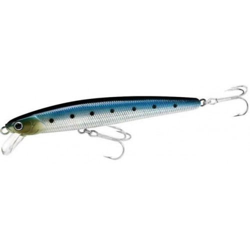 Isca de pesca artificial com corpo azul e prateado e dois anzóis duplos