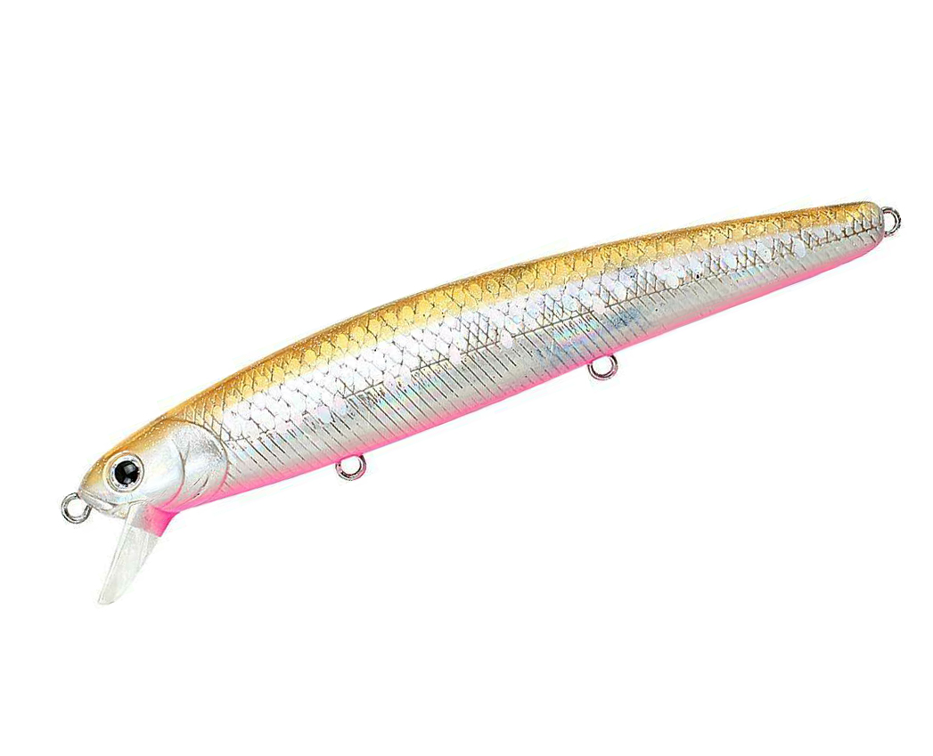 Isca de pesca artificial dourada e prateada com olhos e textura de escamas