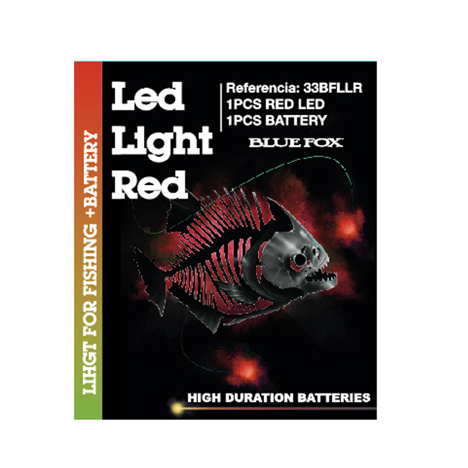 Embalagem preta para luz LED vermelha de pesca da BLUE FOX com texto em branco e laranja