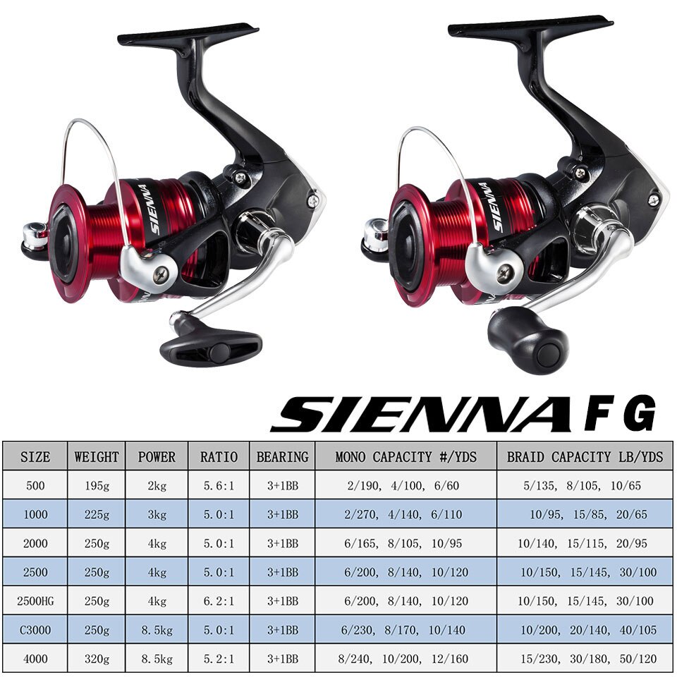 Dois carreteis de pesca rotativos SIENNA FG em preto, vermelho e prata com tabela técnica
