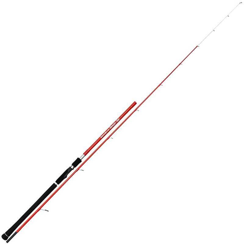 Cana de pesca vermelha e preta com empunhadura preta e passadores metálicos