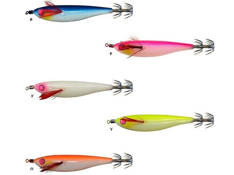 Sete iscas artificiais coloridas etiquetadas para pesca