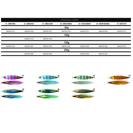 Vega Bulldog, em 150 e 200 gr. foram desenhadas para a captura de grandes exemplares. A sua queda lenta tipo folha seca, permite que durante a queda os grandes pargos, corvinas, lírios, robalos, tenham o movimento ideal para provocar o seu ataque.
