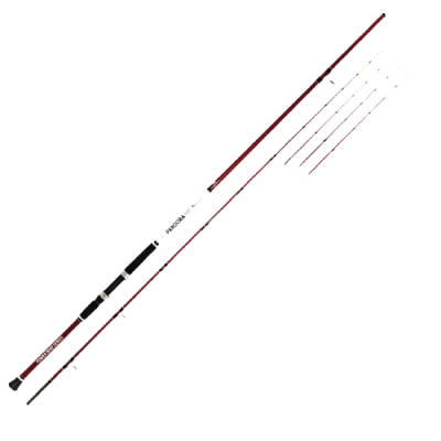 Vara de pesca vermelha com cabo preto e várias pontas separadas