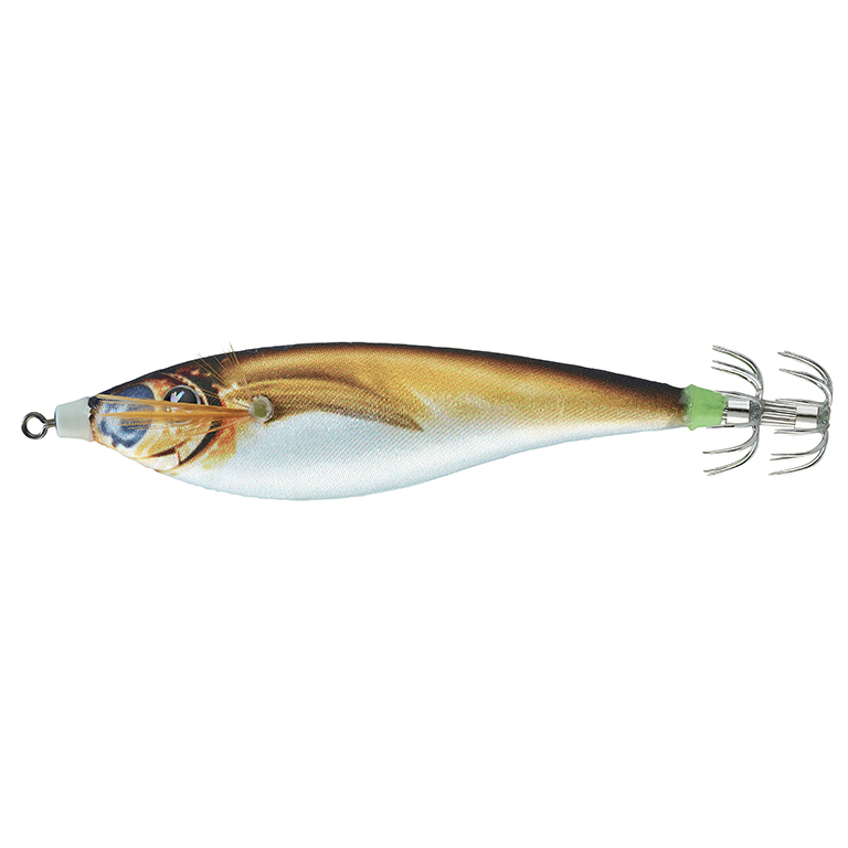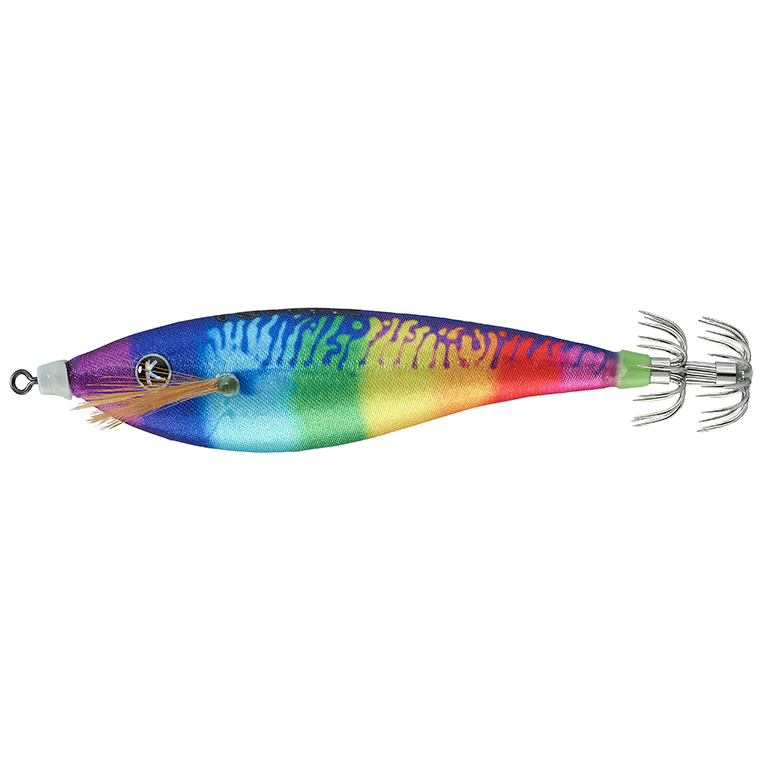 Isca de pesca em forma de lula azul e branca com pontos pretos e gancho múltiplo